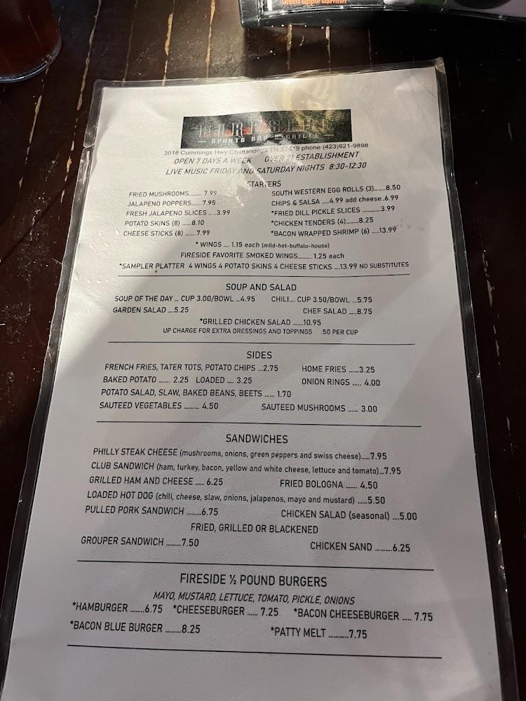 Welcome to Fireside Grille, your go-to local sports bar in Chattanooga, TN, where upscale food meets a vibrant atmosphere! Enjoy mouthwatering dishes, a full bar offering an array of beers and spirits, and attentive service from our dedicated staff. Join us for live music on Friday and Saturday nights, or unleash your talent at Thursday night Karaoke. With options for dine-in, takeout, and delivery, your dining experience remains convenient and delightful. Located at 3018 Cummings Hwy #H, we invite you to unwind on our terrace and savor the flavors that make Fireside Grille a must-visit destination!